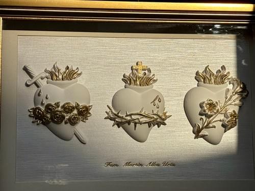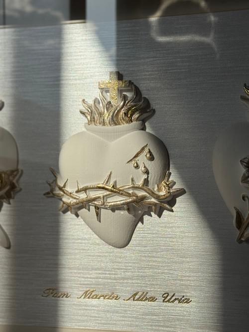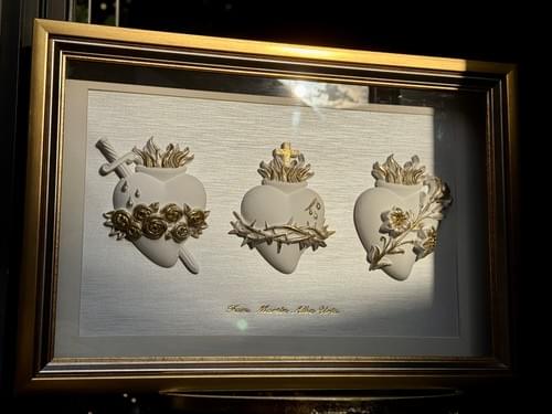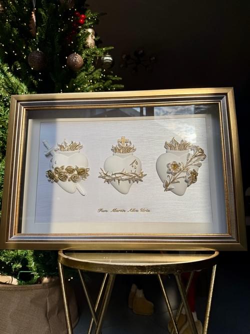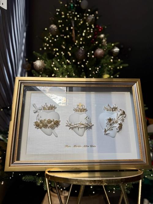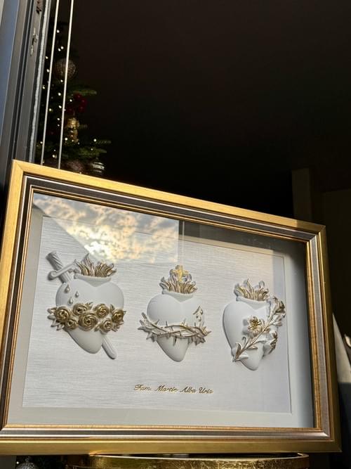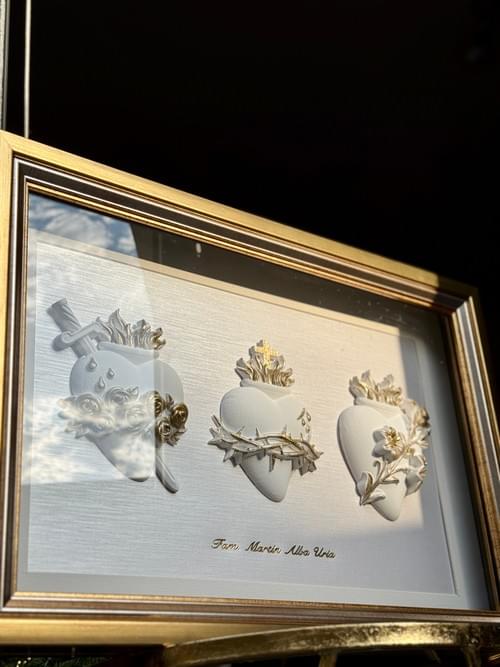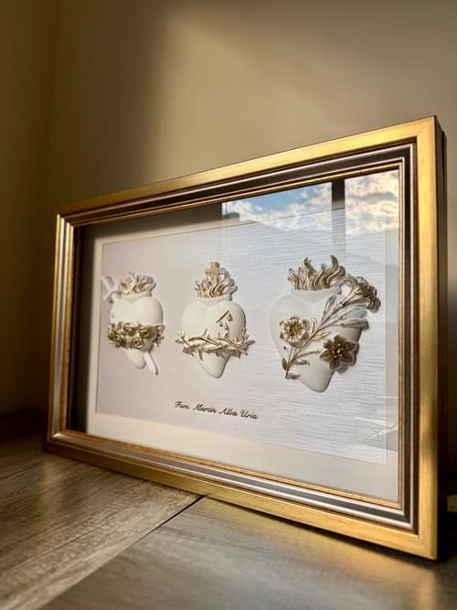 El cuadro de los Tres Corazones de la Sagrada Familia nos introduce en el misterio santo del hogar de Nazaret, donde Dios quiso habitar entre nosotros. El Sagrado Corazón de Jesús, revelado con amor a Santa Margarita María de Alacoque en el siglo XVII, palpita con el fuego de la misericordia divina y la redención. El Inmaculado Corazón de María, dado a conocer en Fátima en 1917 a los pastorcitos —especialmente a Lucía—, resplandece con su pureza, su docilidad al Espíritu Santo y su maternidad espiritual sobre toda la Iglesia. Y el Casto Corazón de San José, protector de Jesús y de María, nos recuerda su fe firme, su obediencia silenciosa y su misión confiada por Dios de custodiar aquello que es sagrado.
