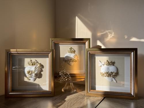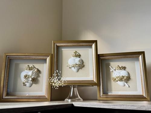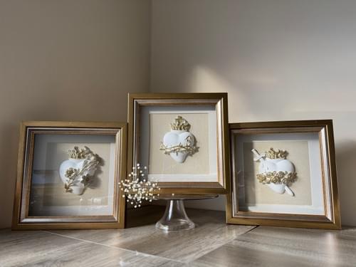 Este set de tres cuadros reúne, en un mismo espacio de luz y devoción, al Sagrado Corazón de Jesús, al Inmaculado Corazón de María y al Casto Corazón de San José. Cada imagen, aunque individual, dialoga con las otras dos, creando un hogar espiritual donde el amor, la pureza y la protección se entrelazan.